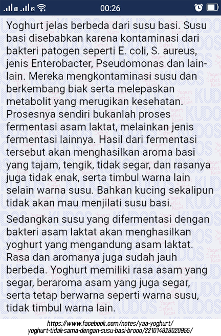 Yogurt itu ngga sama dengan susu basi... kalau susu basi itu...susu yang tidak sengaja menjadi basi dan rasanya telah menjadi asam... Kalau Yogurt itu susu yang masih segar tapi (justru) sengaja dibuat menjadi basi dan asam.